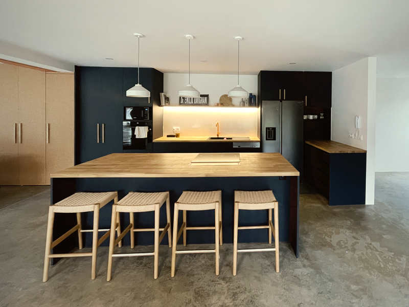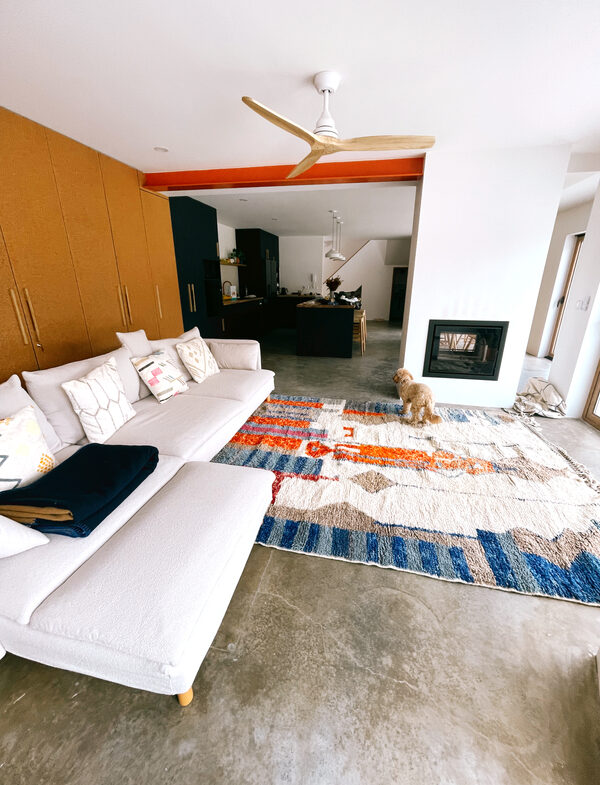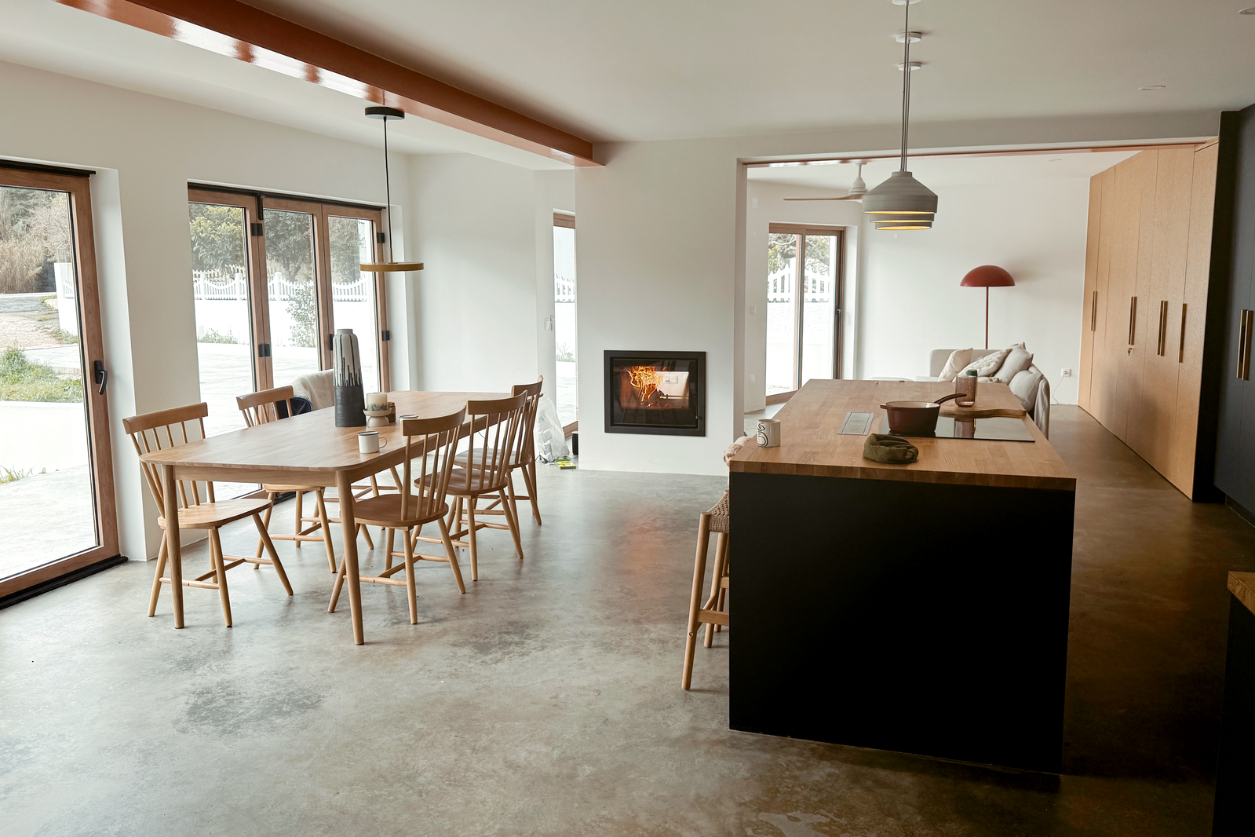 A bright, light open plan living area with brand new kitchen, dining and living room, large doors lead out into the garden and valley beyond. A double sided fireplace warms up the house during winter